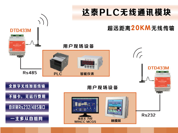 PLC無線通訊模塊20年工業(yè)無線測控行業(yè)經(jīng)驗(yàn)沉淀所研發(fā),DTD433M采用全數(shù)字無線加密的傳輸方式,通過Rs485/232接口與PLC、DCS、智能儀表及傳感器等設(shè)備組成無線測控網(wǎng)絡(luò)。達(dá)泰PLC無線通訊模塊同時(shí)能與組態(tài)軟件、人機(jī)界面、觸摸屏、測控終端等工控產(chǎn)品實(shí)現(xiàn)無線485協(xié)議、西門子PPI協(xié)議、MODBUS協(xié)議、三菱N:N協(xié)議、臺達(dá)PLC、歐姆龍PLC的通信協(xié)議等的組態(tài),為工業(yè)測控領(lǐng)域提供了遠(yuǎn)距離無線通信的解決方案,大大節(jié)省了系統(tǒng)集成商現(xiàn)場調(diào)試和售后維修服務(wù)的時(shí)間及費(fèi)用。PLC無線通訊模塊DTD433M既可以實(shí)現(xiàn)點(diǎn)對點(diǎn)通信,也適合于點(diǎn)對多點(diǎn),分散不便于挖溝布線等應(yīng)用場合,傳輸距離可達(dá)50KM,簡單,可靠,高效。